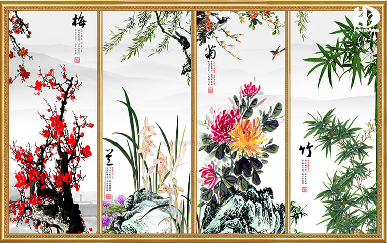 • Tranh hoa lá và động vật: Hình ảnh hoa mai, hoa sen, hoa mẫu đơn, chim chóc, cá, hay ngựa là các chủ đề quen thuộc trong tranh thủy mặc. Mỗi loài hoa hay con vật đều mang một ý nghĩa riêng, tượng trưng cho sức mạnh, sự thanh cao hoặc thịnh vượng.
